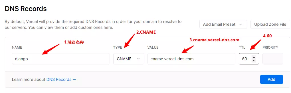 DNS配置到Vercel之后,相当于Vercel接管了配置域名的权力,之后子域名就不需要再进行配置了(如果在国内备案过,请走方式二)Add之后,它会弹出来一些需要做的配置,接下来需要去我们的域名提供商那里根据Vercel给出的要求进行域名配置。