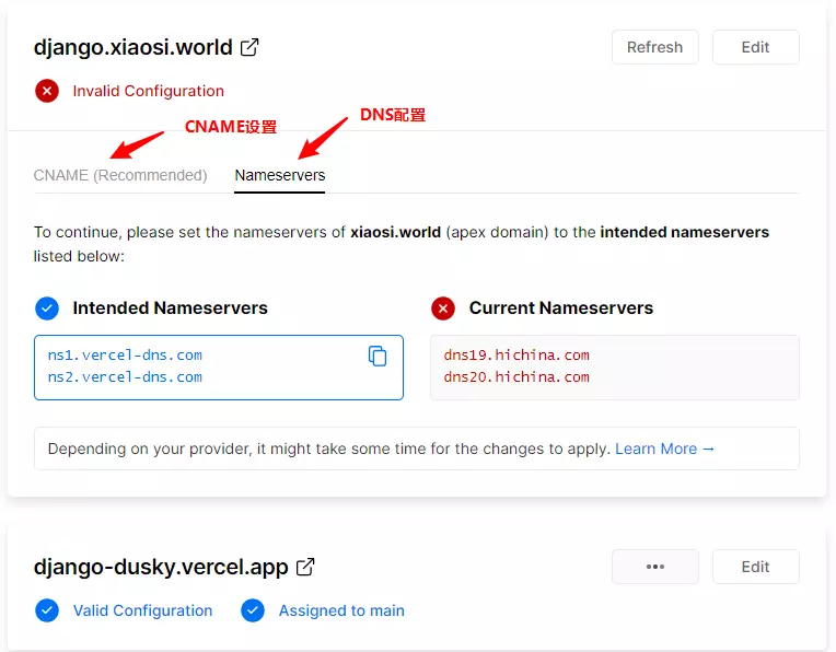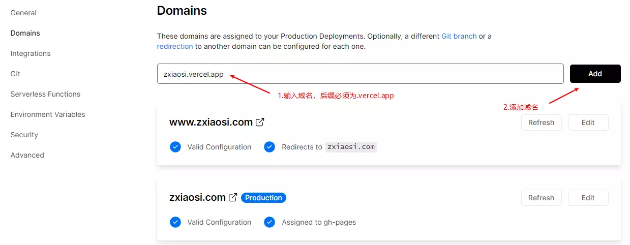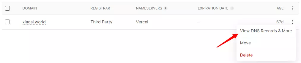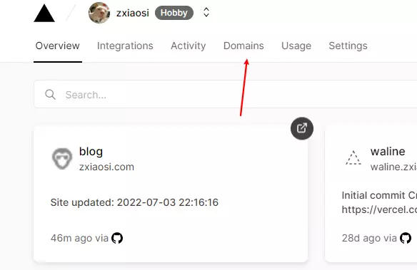 CNAME解析记录,回到Vercel仪表盘,点击Domains点击