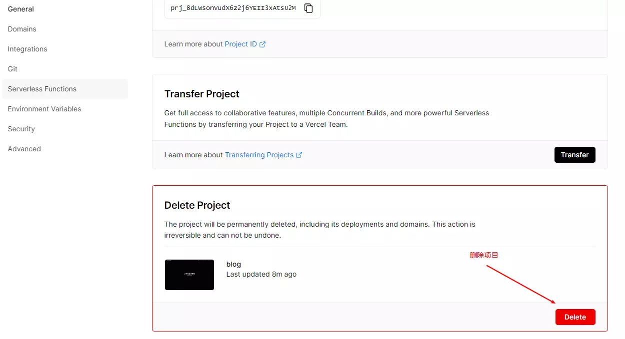 SettingsGeneral页面:常规设置,可以更改Vercel项目名、模板、项目仓库文件夹、删除项目Domains页面:项目域名,见下文Git页面:Git设置,可更改仓库分支(更改之后记得重新部署一下)Serverless Functions页面:服务器所在地,可改为香港(Hong Kong)