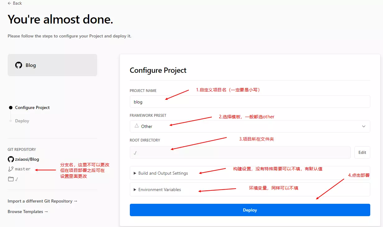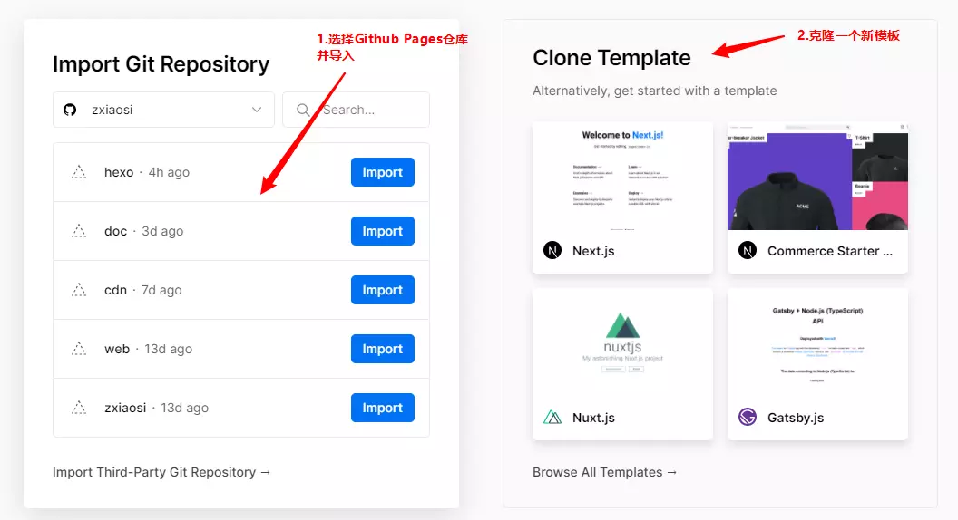 Github Pages导入,或者新建一个模板(Vercel提供了诸多模板)。这里选择导入可以自定义项目名(不是