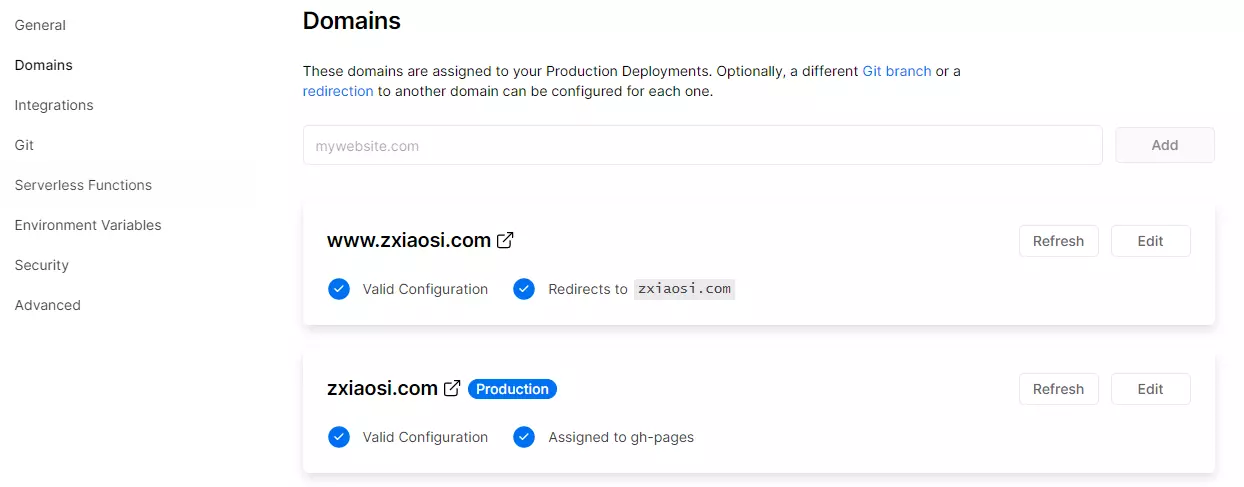 View Domains进入域名配置页面(这里默认显示是Vercel分配的域名)Vercel会为每一个项目自带一个域名,也可以自定义,不过后缀要为*.vercel.app可以点击