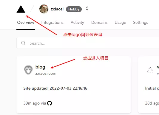 Vercel图标,回到仪表盘,然后点击项目头像进入项目