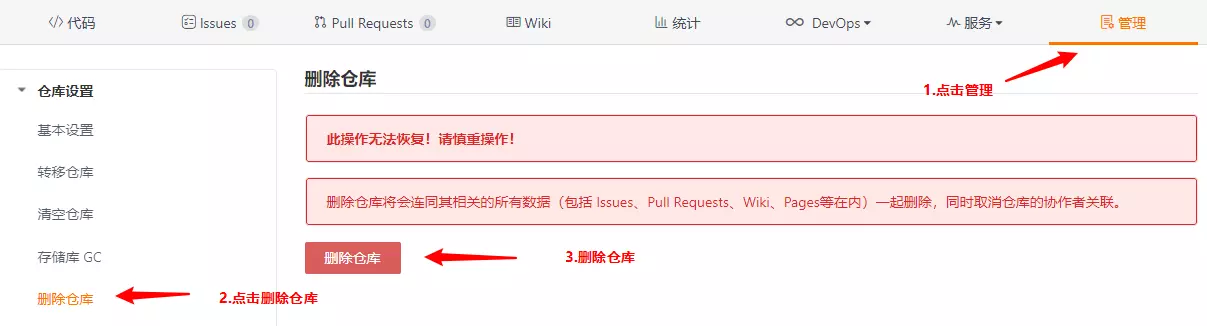 管理–> 找到删除仓库–>删除仓库根据操作输入