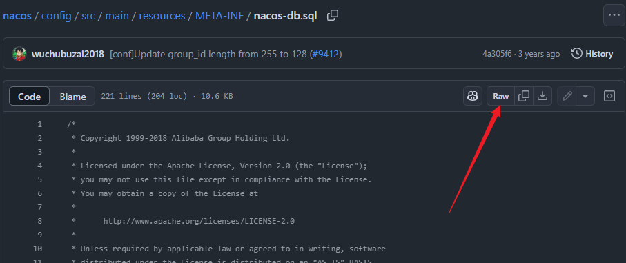 Dockerfile文件,注意替换链接。先找到自己对应版本的nacos-db.sql文件,然后直接点击Raw按钮,即可获取到源码链接1