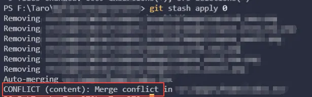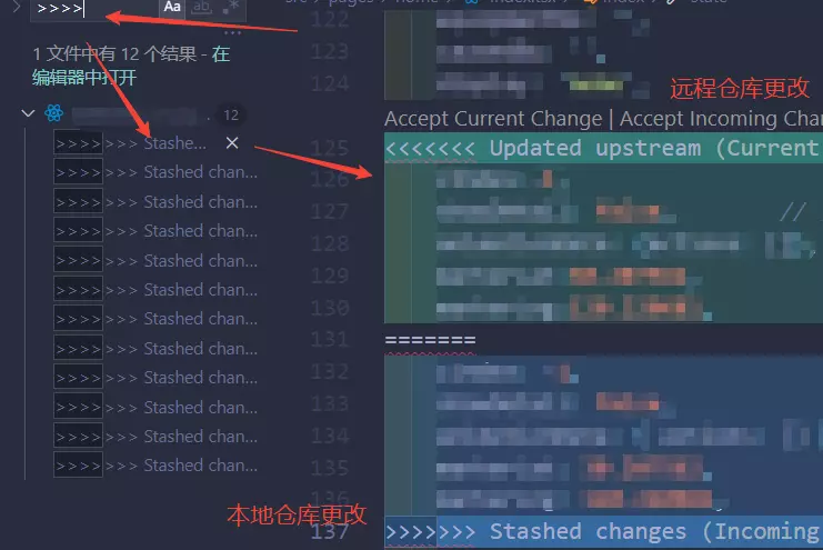 git stash apply 0,注意看记录是否有冲突(下方表示有冲突)解决冲突,以 Vscode 为例,全局搜索