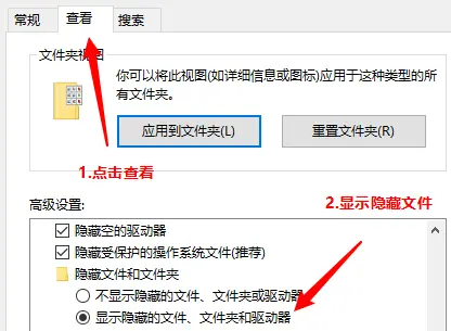 查看,然后选中显示隐藏的文件、文件夹和驱动器