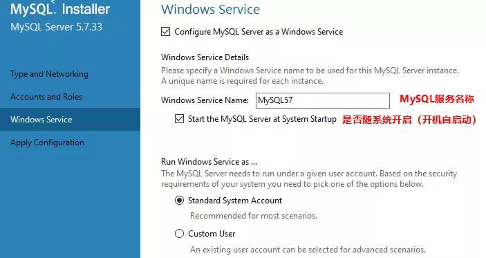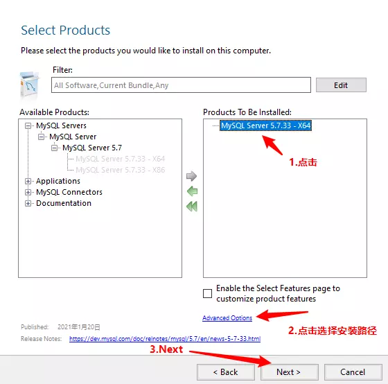 MySQL Server 5.7.33 -X64–>Advanced Options(选择安装的位置)–>Next